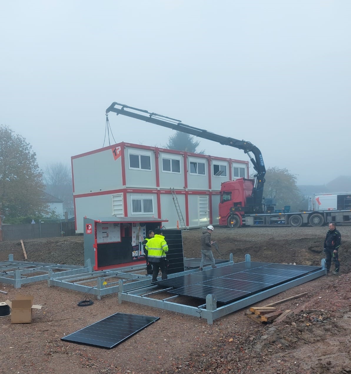 Dans le cadre de la réduction de l’empreinte carbone de TPBat, la production (Jérôme MORELLE) et la cellule Innovation, Recherche et Développement (Romuald CATOUL) ont décidé de tester l’installation de 3 ensembles de 8 panneaux photovoltaïques sur une base vie pour réduire la consommation en électricité sur chantier.