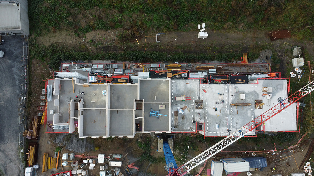 À ce jour, le gros œuvre est bien avancé : le 3ᵉ étage est terminé et les équipes ont entamé la construction du 4ᵉ étage.
